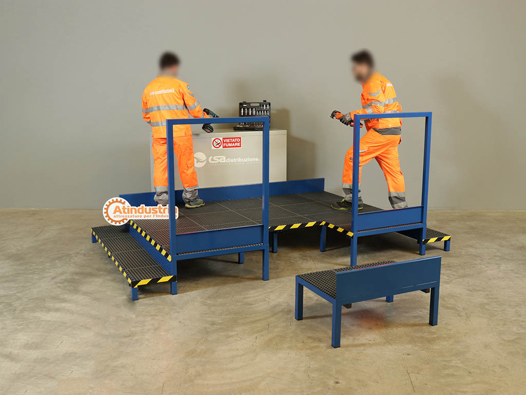 Tipologia di prodotto PEDANA PER POSTAZIONE DI LAVORO CON GRADINI LATERALI D'ACCESSO E MODULO ASPORTABILE PER CONSENTIRE OPERAZIONI DI CARICO SCARICO MATERIALE. 2 PARAPETTI SU UN LATO E BATTIPIEDE SU DUE LATI.