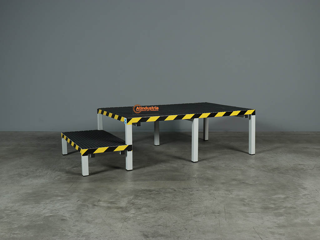 La struttura portante è realizzata in metallo verniciato (colori personalizzabili senza alcun sovrapprezzo purchè colori standard), mentre i piedi dell'operatore appoggiano su di un grigliato in PVC antiolio, antifatica e antiscivolo.La particolarità di questi grigliati è che essendo realizzati in PVC a celle chiuse, non assorbono l'olio, le emulsioni o gli agenti chimici, pertanto non tendono con il tempo a sgretolarsi garantendo una notevole durata nel tempo e la sicurezza all'operatore che lavora su di esse.